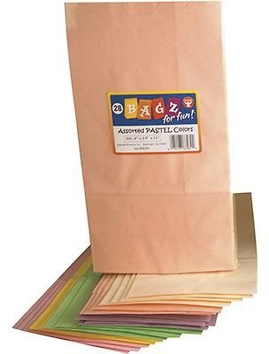 6" x 3 1/2" x 11" pastel assorted color gusseted craft bags are great for puppets, prizes, projects or scraps and are used for quick gift bags, stenciling, personalized lunch bags.