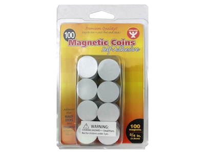 Create your own fridge magnets with these Hygloss self-adhesive magnetic coins. Either display the decorated coins as is or peel off the backing and stick the coins onto posters, classroom word strips, or kids crafts. These 0.75-inch Hygloss self-adhesive magnetic coins stick to wood, metal, plastic, and paper and come in a pack of 100.