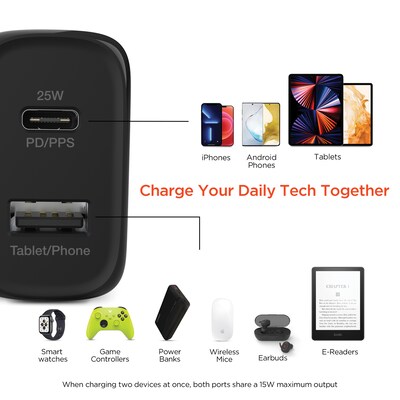 Boost your drive with Power Delivery and PPS efficient fast charging technology! The SpeedBoost Dual-Output USB-C Wall Charger Kit is a complete super-fast charging upgrade package. The charger showcases a 25-watt USB-C PD port with more than 4x the power of standard chargers, capable of taking the newest and biggest Android phones from 0 to 50% in under 30 minutes. And with PPS support for compatible phones, the charger is able to make micro-adjustments throughout the entire super-fast charging cycle that boost its efficiency, charge your phone even faster, and protect your battery from harmful heat buildup. The included 6 ft. USB-C to USB-C cable is rated to carry all that high-speed power to your phone or tablet, and the additional 12-watt USB port is compatible with all charging cables that use a USB-A connector, so you can power up all your daily tech accessories, too: power banks, smartwatches, wireless earbuds, and even video game controllers. Upgrade to cutting-edge charging tech, and feel the speed of a SpeedBoost super-fast charge today!