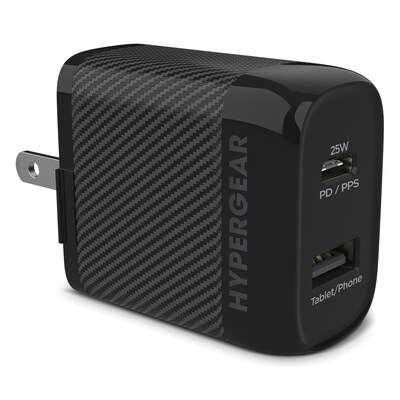Boost your drive with Power Delivery and PPS efficient fast charging technology! The SpeedBoost Dual-Output Wall Charger from HyperGear showcases a 25-watt USB-C PD port with more than 4x the power of standard chargers and is capable of super-fast charging the latest iPhone and Android phones from 0 to 50% in under 30 minutes. And with PPS (Programmable Power Supply) support for compatible phones, the charger is able to make micro-adjustments throughout the entire super-fast charging cycle that boost its efficiency, charge your phone even faster, and protect your battery from harmful heat buildup. With the additional 12-watt high-speed USB-A port, you can fast-charge all your daily tech accessories, too: power banks, smartwatches, wireless earbuds, and even video game controllers. It is compatible with all charging cables that use USB-C and USB-A connectors, including special cables for smartwatches and MagSafe charging. Upgrade to cutting-edge charging tech and feel the speed of a SpeedBoost super-fast charge today!