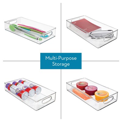 Create a system of order with this sleek, clear plastic bin that organizes office, craft, school supplies, or anything else that needs to be collected in one spot. Its transparent construction offers unobstructed views of your belongings, and its open-top design allows for easy accessibility, simplifying item location and retrieval. This iDesign Storage Bin features comfortable carry handles and stacks attractively for a smarter desk setup, creating your ideal workstation. With iDesign, you can live simply every day.