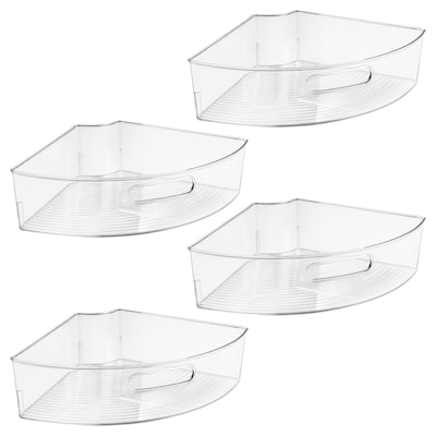 The iDesign Lazy Susan Wedge Organizer Bins (27743M4) are designed to optimize space in corner cabinets. This set includes four clear bins that fit together to form a complete circle, making it easy to access and organize condiments, spices, baking supplies, and more. Each bin features tall outer walls to keep items upright and a built-in handle for easy removal. Made from durable, shatter-resistant plastic, these bins offer a practical and stylish solution for your kitchen storage needs