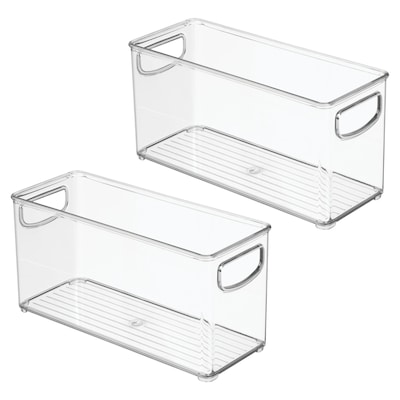 - SMART STORAGE - Reinvent your kitchen space with our iDesign Linus Stackable Pantry Bins; These clear, open-top bins grant immediate reach-in access to food and other perishables, making it easy to find what you need; Bins stack securely to make use of often-wasted vertical space; Easy-grip handles make it easy to move or slide off shelves; The narrow profile fits inside standard or counter-depth refrigerators as well as tight shelf spaces inside pantries and cabinets; Set of 2