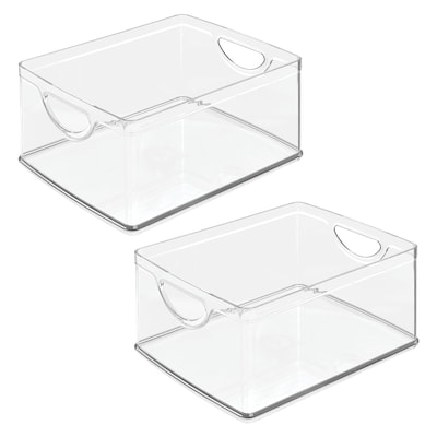 - SMART STORAGE - The iDesign Plastic Pantry Bin corrals kitchen essentials in modern style; Its generous capacity has room to store your most reached-for essentials, from fruits and vegetables to pantry staples to snacks and more; Each clear pantry bin blends seamlessly with your decor, allowing you to keep various kitchen essentials accessible and contained; Set of 2