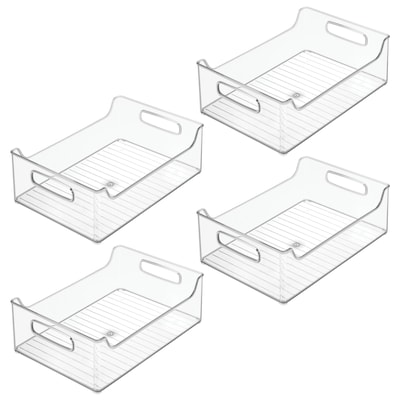 - SMART STORAGE - Reinvent your kitchen space with our iDesign Stackable Pantry Bins; These clear, open-top bins grant immediate reach-in access to food and other perishables, making it easy to find what you need; Bins stack securely to make use of often-wasted vertical space; Easy-grip handles make it easy to move or slide off shelves; Notched sides allow for proper air circulation when stacked, creating storage for fruits and vegetables while conserving space; Set of 4