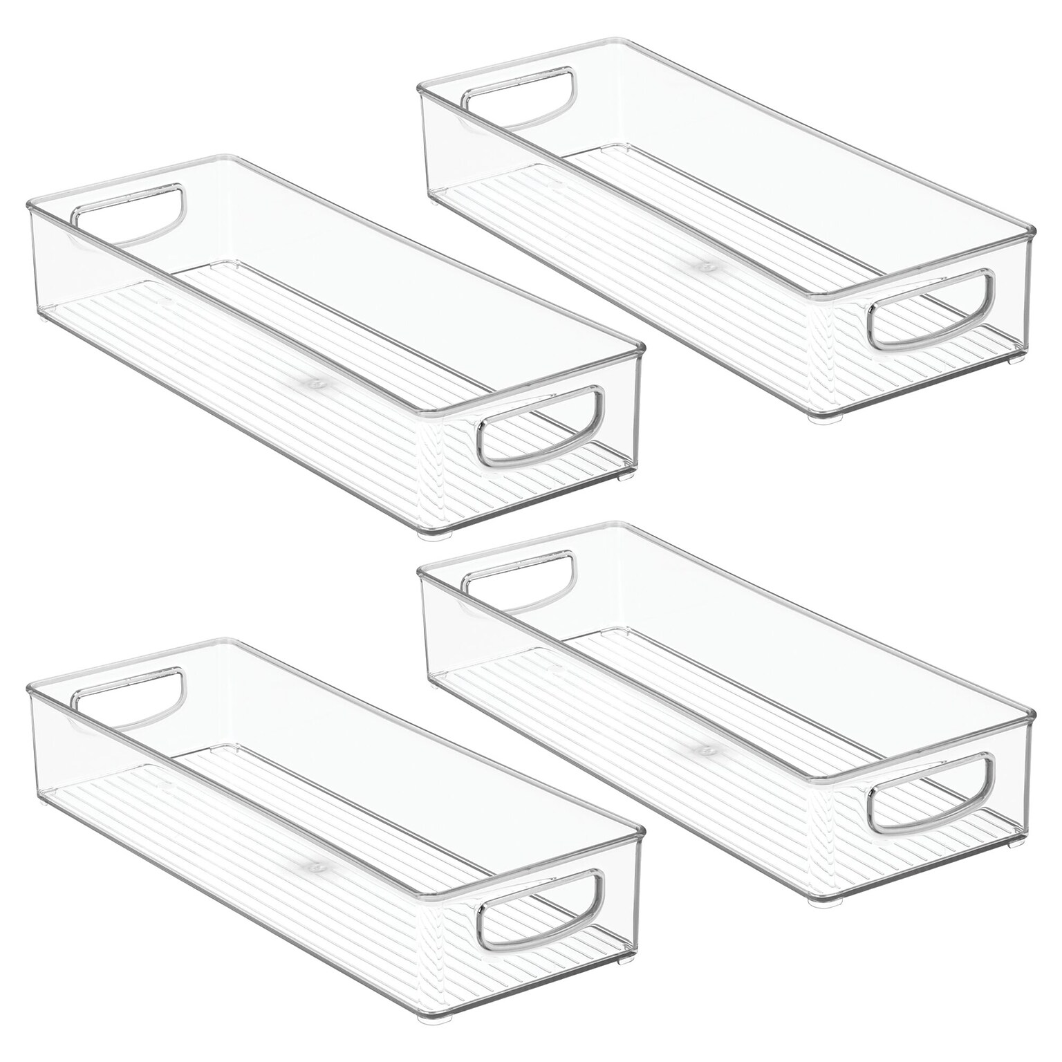 - SMART STORAGE - Reinvent your kitchen space with our iDesign Stackable Pantry Bins; These clear, open-top bins grant immediate reach-in access to food and other perishables, making it easy to find what you need; Bins stack securely to make use of often-wasted vertical space; Easy-grip handles make it easy to move or slide off shelves; The narrow profile fits inside standard or counter-depth refrigerators as well as tight shelf spaces inside pantries and cabinets; Set of 4