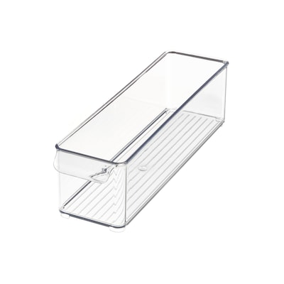 This stackable storage bin makes the perfect desktop organizer. Its slender dimensions make this a tidy solution for corralling small items from markers and highlighters to rubber bands and sticky notes on shelves and desks. Its transparent construction offers unobstructed views of your belongings, and its open-top design allows for easy accessibility, simplifying item location and retrieval. This iDesign Stackable Storage Bin features a sleek front handle and stacks attractively for a smarter desk setup, creating your ideal workstation. With iDesign, you can live simply every day.
