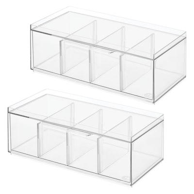 - PULL-OUT DRAWER - The iDesign Crisp Stackable Tea Storage Drawers keeps tea bags and sweeteners upright and visible; The pull-out drawer opens to four permanently divided sections that neatly sort and store your favorite herbal teas, sweeteners, sugar packets, and more with ease; Finished with a sleek front handle, this storage drawer slides out smoothly and makes grabbing what you need quick and effortless; Set of 2