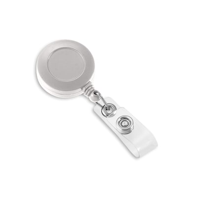 The white IDville Round Badge Reels (solid) feature a slide clip attachment that securely fastens to clothing or bags.