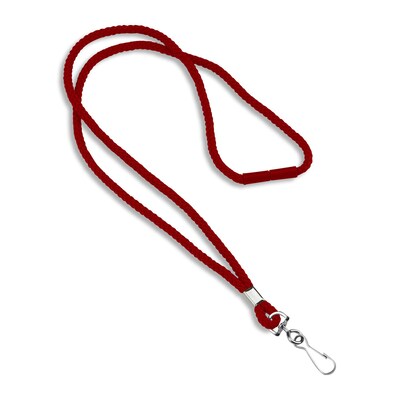 The 36" red IDville Premium Round Woven Breakaway Lanyards, available in a pack of 25, and features a metal J-Hook that securely holds your ID badge.