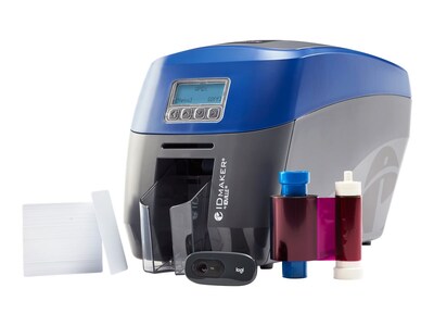 - System includes: ID Maker Apex 2-sided printer, ID Maker Basic Software, 100 blank PVC plastic cards, 300-print YMCKO printer ribbon, and a printer cleaning kit.