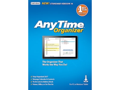 The AnyTime Organizer Standard 16 by Individual Software has all the powerful tools you need to organize your personal and professional life. The friendly and simple interface makes it easy to access the Calendars, To-Do lists, Contacts, Notebooks, Passwords, Expenses, and hundreds of design combinations for printable calendars. Let the AnyTime Organizer Standard 16 help you organize your life, and you will see why more people choose AnyTime over any other brand of organizer software.