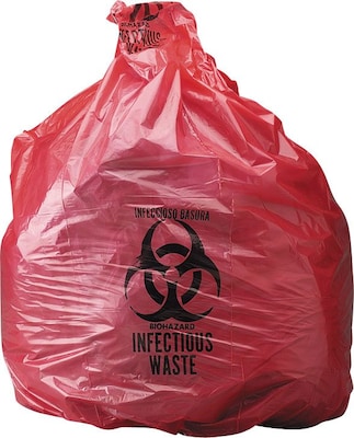 Unimed Infectious waste bag in red color has a thickness of 1.25 mil and withstands a capacity of 3 gal.