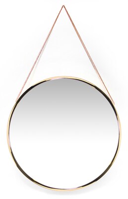 A stylish round wall mirror featuring a beautiful gold plastic frame and real metal chain for hanging. This contemporary mirror is 17.5" in diameter, and will transform your space with its simple elegance.