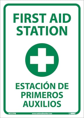 National Marker "First Aid Station " bilingual safety sign with graphic measures 14" x 10" and is made adhesive vinyl material for added durability.