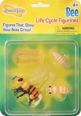 Insect Lore Bee life cycle stages set includes accurately painted and sculpted oversized, anatomically correct figures that are made from flexible plastic for more durability. Set shows egg, larva, pupa and adult stages of honey bee.