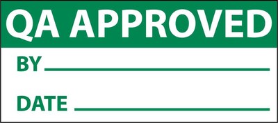 Inspection Labels; Qa Approved, Grn/Wht, 1" x 2 1/4", Adhesive Vinyl (27 Labels)