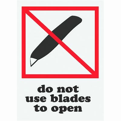 Self-adhesive "do not use blades to open" labels for international box packaging and pallet shipping. See Product Details chart for more information.