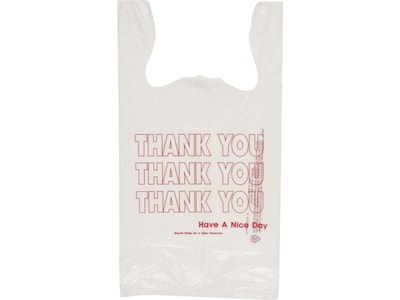 Give customers a handy way to carry their goods home with these T-shirt bags. The integrated handles fit comfortably in hand, while the plastic construction offers added strength to hold a variety of items. Each bag features a kind message thanking shoppers for doing business with your company. With 900 pieces in each case, these Inteplast IBS bags are ideal for use in restaurants, retail shops, and convenience stores.