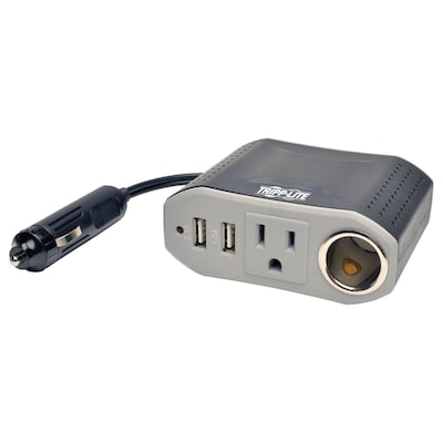 The Tripp Lite PV100USB PowerVerter ultra-compact car inverter delivers 100 W continuous and 200 W peak household power. This inverter in gray color has plastic construction for durability. It incorporates Cigarette lighter adapter and NEMA 5-15R, 2.1 A USB as well as 1 A USB receptacles for reliable connectivity. This inverter features 12 A fuse for overload protection. It transforms 12 VDC battery power to standard 120 VAC power. This power inverter measuring 3.94" x 1.61" x 3.27", powers Smartphones, laptops, tablets, GPS units, game systems, portable TVs, DVD players, MP3 players and other electronics. It comes with 3' cord for extended connectivity. The built-in ventilation fan keeps the inverter's interior cool during extended use.