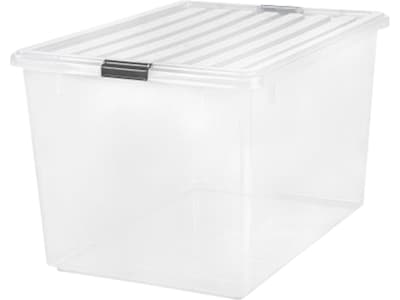 This Iris 132 qt. clear storage box is oversized to fit large storage needs. Securely stack multiple units to maximize storage space. It is great for storage in the garage, basement, attic, or closets.