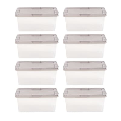 IRIS USA's 17 quart snap top storage bins are great for storing clothes, boots/shoes, and most household items. The snap tight lids securely fastens to the body and keeps contents in place. The clear body allows you to quickly identify the contents and access what you need. These plastic storage bins are stackable, the indexed lid let's you stack easily and securely to maximize your storage space. Set of 8.