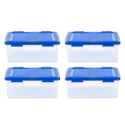 The 4 pack IRIS 30 Quart WeatherPro Heavy Duty Storage Bins makes organizing simple and easy. Latching buckles secure the durable body and lid, blocking out moisture, dust, and insects. Grooves on the lid are designed to create a stable and secure stacking system allowing you to maximize your storage space and create a customized storage Solutions. Safely store up to 30 pounds of household goods, craft supplies, gardening supplies, or other items in this handy multi-purpose storage container.