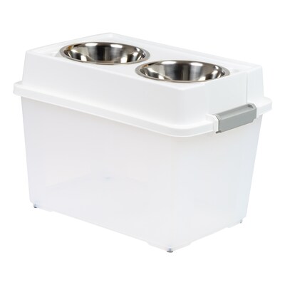 Improve your pet’s digestion and help reduce neck strain with this Elevated Feeder by Remington These feeders incorporate convenient airtight storage bin capacity under two stainless steel food and water bowls, kept dry and fresh by an airtight seal and snap-tight latches. Each bowl holds up to 2 quarts of water or food, and the storage space holds up to 64 cups or 50 lbs.. of dry pet food. Storage bin can also be used for leashes, toys, treats, other pet food, and more. Great for indoors, outdoors, camping, or traveling. BPA free.