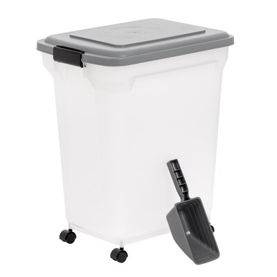 The IRIS Premium Airtight Pet Food Container is the perfect container for all your pet food storage needs. This 55 quart plastic container with lid and scoop has an airtight seal that locks in freshness and keeps moisture, humidity, and pests out. Plastic food container holds 45 lbs.. of dry pet food. The snap lock latch signals that the lid is secured shut, while the full top offers easy access to the pet food. Designed as pet food bins, these BPA free airtight storage bins offer many other uses as well, such as pellet storage, grain storage, bird seed storage, cat litter storage, or even as a charcoal or wood chip storage container. The IRIS Premium Airtight Pet Food Container is translucent, versatile, functional, and can be used in any area of the house. Made in the USA. FDA-compliant and BPA-free material.