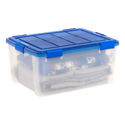 The IRIS 60 Quart WeatherPro Heavy Duty Storage Bins makes organizing simple and easy. Latching buckles secure the durable body and lid, blocking out moisture, dust, and insects. Grooves on the lid are designed for a stable and secure stacking storage system allowing you to maximize your storage space and creates a customized storage solution. Safely store up to 50 pounds of household goods, craft supplies, gardening supplies, or other items in this handy multi-purpose storage container. These heavy duty plastic storage bins are compatible with IRIS WEATHERPRO Storage Bins in 16, 26.5, 44, and 60 quarts. Striving to provide "Solutions to Everyday Living", IRIS' products are Green Circle Certified and BPA-Free allowing you to shop with confidence and peace of mind.