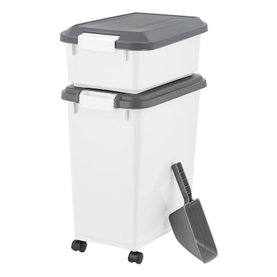 Help keep your furry friend's food and treats dry and fresh with the IRIS 3-Piece Airtight Dog & Cat Food Container. This set includes a 30-pound dry food container, a 11-pound treat container and a 2-cup matching food scoop. The convenient storage containers are designed with airtight seals and snap-lock latches— these helps keep moisture, humidity and pests out! The containers are also cleverly designed with frosted sides, so you'll always know when the level is low and it's time to get more food or treats. And to save your back the stress of constantly bending over to pick up heavy bags of food, the four rotating casters allow for easy movement around your kitchen or pantry!