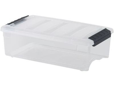 This modular storage system is built to meet your needs. This Iris Stack & Pull 5.7 qt. storage box easily stores shoes, craft supplies, office supplies, and more. Buckle-up latches keep the lid securely in place, and the built-in handle makes it easy to pull the box off of a shelf. This box stacks neatly with other units in the Stack & Pull series. It comes clear with black latches. Made in the USA.