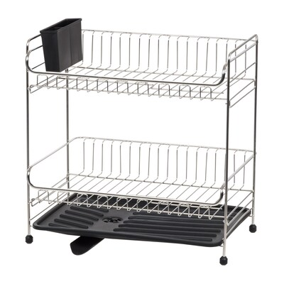 This IRIS USA dish rack sits on a plastic drip tray that catches water as it falls off the dishes. The draining spout on the bottom of the tray lets you drain water right into your sink. Spout rotates 360° so it can reach the sink no matter which side you place the rack on, letting you place it in the spot that best suits your countertop. The rust-resistant stainless steel frame means this dish rack is built to last and is easy to clean. Compact design is great for fitting a lot of dishes in a small space. Rubber feet on legs keep rack from sliding when loaded with dishes. Drain spout can be removed making cleaning quick and easy.