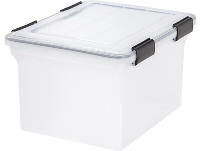 The Iris WeatherPro plastic storage box has a heavy-duty seal in the lid to preserve and protect contents. With the multiple latches that lock strongly and securely onto the durable lid, the bin creates a vacuum-like environment inside, blocking out moisture, dust, etc. Perfect to store clothes, documents, food, hunting gear, camping gear, tools, and other large items.