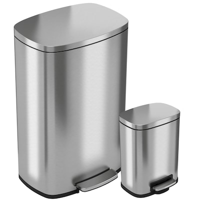 The iTouchless SoftStep Step Pedal 13.2 Gal Kitchen Trash Can and 1.32 Gal Bathroom Trash Can Combo Pack offers big value with a matching set for both your kitchen and bathroom. Enjoy smooth, easy pedal operation and a silent, gentle lid close every time. Both bins feature AbsorbX odor filters to keep smells contained, along with an elegant, fingerprint-proof stainless steel finish. With removable inner buckets, taking out the trash is always quick and convenient.
