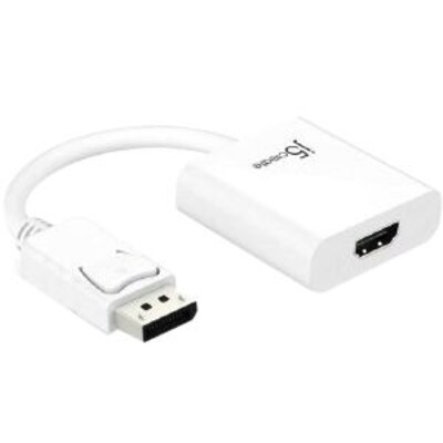 The j5 Create JDA154 DisplayPort to HDMI adapter in white, easily connects Mac or PC to an external monitor, HDTV, projector or other display device using a VGA, DVI or HDMI input. The cable has a plastic housing and features one DisplayPort male DisplayPort 1.1a digital audio/video connector on the first end and one HDMI female HDMI 1.3a digital audio/video connector on the second end.