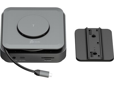 This j5create compact multi-port dock is great for office applications, featuring essentials such as two HDMI outputs, USB ports, Gigabit Ethernet, SD/microSD card reader, audio jack, and an upgraded Power Delivery 3.1 specification. It comes with a mount for saving space and gives you the ability to connect your MacBook or other USB Type-C compatible laptops to a 4K monitor or TV. With USB Power Delivery 3.1, it'll take you to a new flexible power application: you'll be able to charge your laptop and power your peripherals with a single USB Type-C power adapter, even if your laptop only has one USB Type-C port. The top of the dock functions as a wireless charging pad that supports up to 15W fast charging. Access a wired network through the Gigabit Ethernet port for a fast and stable network connection. It is also equipped with a cable storage compartment which ensures an easy connection regardless of your USB Type-C port's location. Through a single USB Type-C (Thunderbolt 3, 4, and USB4 compatible) host cable, this compact adapter provides all the essential connectivity you need to create a workstation virtually anywhere.
