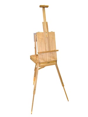 Beautifully handcrafted from eco-friendly Elm hardwood, the Weston is an extraordinary version of an ever-popular design that takes the easel to a new level. The telescoping front legs adjust to rough terrain, and the braced back leg holds the easel securely in place.Non-skid pads on the feet add extra stability, and the easel-s removable compartments are perfect for storing materials. This unfinished wood easel tilts past vertical, has an adjustable lid and canvas handle, and includes an 11 in. x 16 in. wooden palette.Maximum easel height is 69 1/2 in. Maximum canvas height is 33 in. When not in use, the easel folds up to 16 in. x 22 in. Its weight when empty is 14 lb.