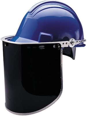 - Locking device holds face shield securely in the up or down position