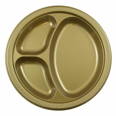 Plates With Convenient Compartments! JAM Paper; Gold 3 Compartment Divided Plastic Party Plates offer a colorful and convenient option for any occasion. If you're throwing a fun party, barbeque, reception, banquet, or any other event, colorful plastic plates remove the chore of washing dishes while adding a pop of color to your decoration. These large plastic plates come in both divided 'compartment' plates or simple plan plates as well! Making them perfect for the kids or adults who like to have a little fun with their meals! Measuring 10.25 inches, these reusable plates are made of sturdy, smooth, plastic and sold in packs of 20. Details, Size: 10.25 inches (Large) Color: Gold Quantity: 20 Plates