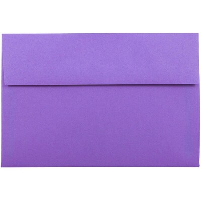 JAM Paper® Brite Hue Violet Recycled A8 Invitation Envelopes are made out of smooth, high quality, 30% recycled, 24lb paper. Each of these booklet style envelopes measures 5 1/2 x 8 12/8 inches in size. Each one has a straight flap and a reliable gum closure to keep items secure as they travel through the mail. A perfect choice for any mailed items that needs to stand out and brighten up the recipients' mood, this envelope features a vibrant violet purple color! Use them to add a burst of fashion and fun to any mailed item! This pack contains 25 envelopes. These purple envelopes are great for sending invitations to your next big event, mailing promotional materials to customers, and more!