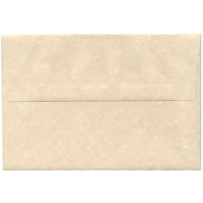 JAM Paper® Parchment Natural Recycled A8 Invitation Envelopes measure 5 1/2 x 8 1/8 inches in size and are made out of smooth, 30% recycled, 24lb paper. This pack contains an even total of 50 envelopes. Each envelope in this set features a light brown natural parchment color with a marbled appearance. These envelopes have straight flaps and reliable gum closures to keep the items placed inside of them secure as they are transported through the mail. Sure to give any items mailed in them a unique and elegant appearance, these envelopes are great for A8 sized invitations, greeting cards, Thank You cards, and much more!