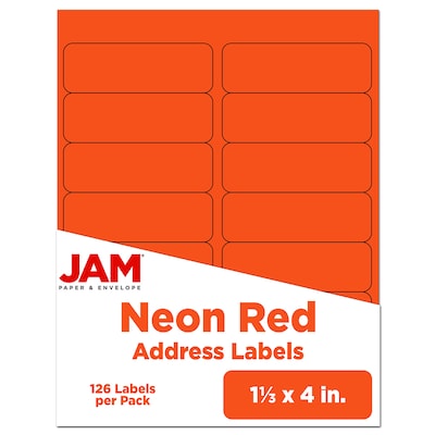 JAM Paper® Address Labels, 1 1/3" x 4", Neon Red, 14 Labels/Sheet, 9 Sheets/Pack, 126 Labels/Pack (359329610)