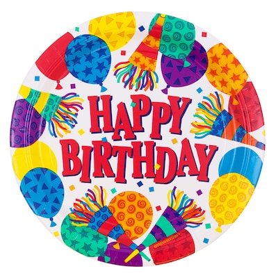 Fun Plates You Can Almost Hear! Nothing makes a birthday party better than the colorfully vivid design of JAM PaperColorful Celebration Design Party Plates. These beautifully designed plates have images of noise makers and multi colored balloons that have patterns of stars and swirls on them. In the center is the classic writing of the words "Happy Birthday" in powerfully red text. Each plate in this 8 plate set measures 9 inches in diameter, the perfect size for holding everything from a slice of pizza to large slices of cake dessert. Plates are made from sturdy cardstock material so they can handle multiple servings of food at one time. The smooth food safe glossy finish ensures that even the least frozen ice cream cake can't make these plates soggy. For ultimate convenience, each plate is disposable and recyclable. Details Size: 9 inch diameter Design: Colorful Celebration Color: Purple, Blue, Light Blue, Red, Orange, Green, Yellow Quantity: 8 Paper Plates