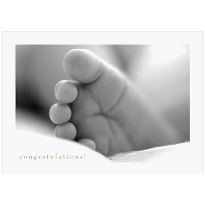 JAM Paper® Baby Foot Blank Congratulations Card Sets include 25 cards. Each of these cards is made out of sturdy cardstock and is 5.6 x 7.9 inches in size. . On the front of the card, there is a black and white photograph image of an infant's foot resting on a white blanket. There is a white border around this. In the bottom right corner, the word "Congratulations" is written in green font. Use these cards to congratulate friends or family members on pregnancy announcements or births of new babies! The inside of each of these cards is blank, providing you with space to include any note or message you would like your new-parent-recipients to read.