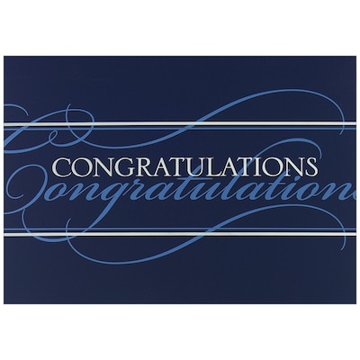 JAM Paper® White and Blue Script Congratulations Blank Card Set comes with 25 cards and 25 white envelopes of a corresponding size! Each card is 5.6 x 7.9 inches in size and is made of durable cardstock. These cards have a dark blue color on the outside and are completely blank and white on the inside. On the front of each card, "Congratulations" is written twice, once in basic white font, and then again underneath in light blue calligraphy. Above and below this repeated word, there are white and light blue basic double line borders. Send this card to congratulate friends or family members on promotions, marriages, graduations, or any life achievement!