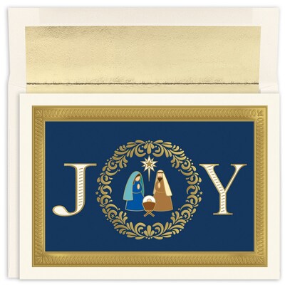 Reach out to loved ones across the globe or next door with JAM Paper® Christmas Cards & Matching Envelopes Set! This Joy Nativity card set includes 16 cards featuring Mary and Joseph surrounding Baby Jesus within the word 'JOY.' The inside message reads "May the love and warmth that is all around us at Christmas time fill your heart with joy and shed radiance over the year that lies ahead" with plenty of blank space to write your own wishes to friends and family! White inner gold foil lined envelopes measure 5.6 x 7.9 and comfortably hold each 5 5/8" x 7 6/7" card. This pack includes 16 cards and 16 envelopes.Size: 5.625in x 7.857in/ 5.6in x 7.9in | Color: Joy Nativity | Quantity: 16 cards/16 envelopes