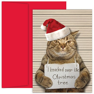 Send a funny holiday greeting this season with JAM Paper® Christmas Card Sets! Caught knocking over the Christmas tree, a Santa hat-wearing cat poses for a mugshot in this Bad Cat Set. Friends and family (those especially who can relate) are certain to get a good laugh out of this funny set! Printed inside using unique red ink: "May Your Holidays Be Filled With Less Naughty And More Nice! Merry Christmas." From religious cards to fun wintery scenes, we offer a variety of designs to suit your holiday needs! This pack contains 16 cards and 16 matching red envelopes. Each card measures 5 5/8" x 7 7/8" and has a smooth finish.Size: 5.625in x 7.875in| Color: Red | Quantity: 18/pack