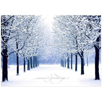 Are you dreaming of a white Christmas? Send some old-fashioned holiday cheer with this JAM Paper® Christmas Card set. Each card contains a comforting, nostalgic image of a snowy tree-lined pathway as the words "Season's Greetings" adorn the base in elegant typeface and shimmering gold. Cards are made with smooth 65-lb cardstock and open upward to reveal a blank interior, leaving room for a personalized and creative holiday message. Every pack comes with 25 cards along with matching envelopes. Add more fun and merriment to this joyful time of year with a touching, sentimental greeting!
