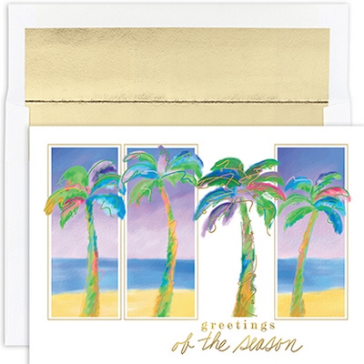 JAM Paper® Christmas Card Sets are all you need to send this year's season's greetings. This Palm Trio Set creates a tropical, laid-back vibe that recipients are certain to love, as each card features unique tie-dye colored palm trees with a serene ocean background and the greeting "Greeting of the season" written in gold. Printed inside using unique blue ink: "May Your Holidays Be Merry And The New Year Bring You Every Happiness!" From religious cards to fun wintery scenes, we offer a variety of designs to suit your holiday needs! This pack contains 18 cards and 18 matching gold foil lined white envelopes. Each card measures 7 7/8" x 5 5/8" and has a smooth finish.Size: 7.875in x 5.625in | Color: White | Quantity: 18/pack